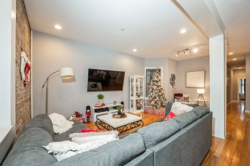 rehabbed grey stone on chicago ave in ukrainian village! white shaker cabinets in kitchen,...