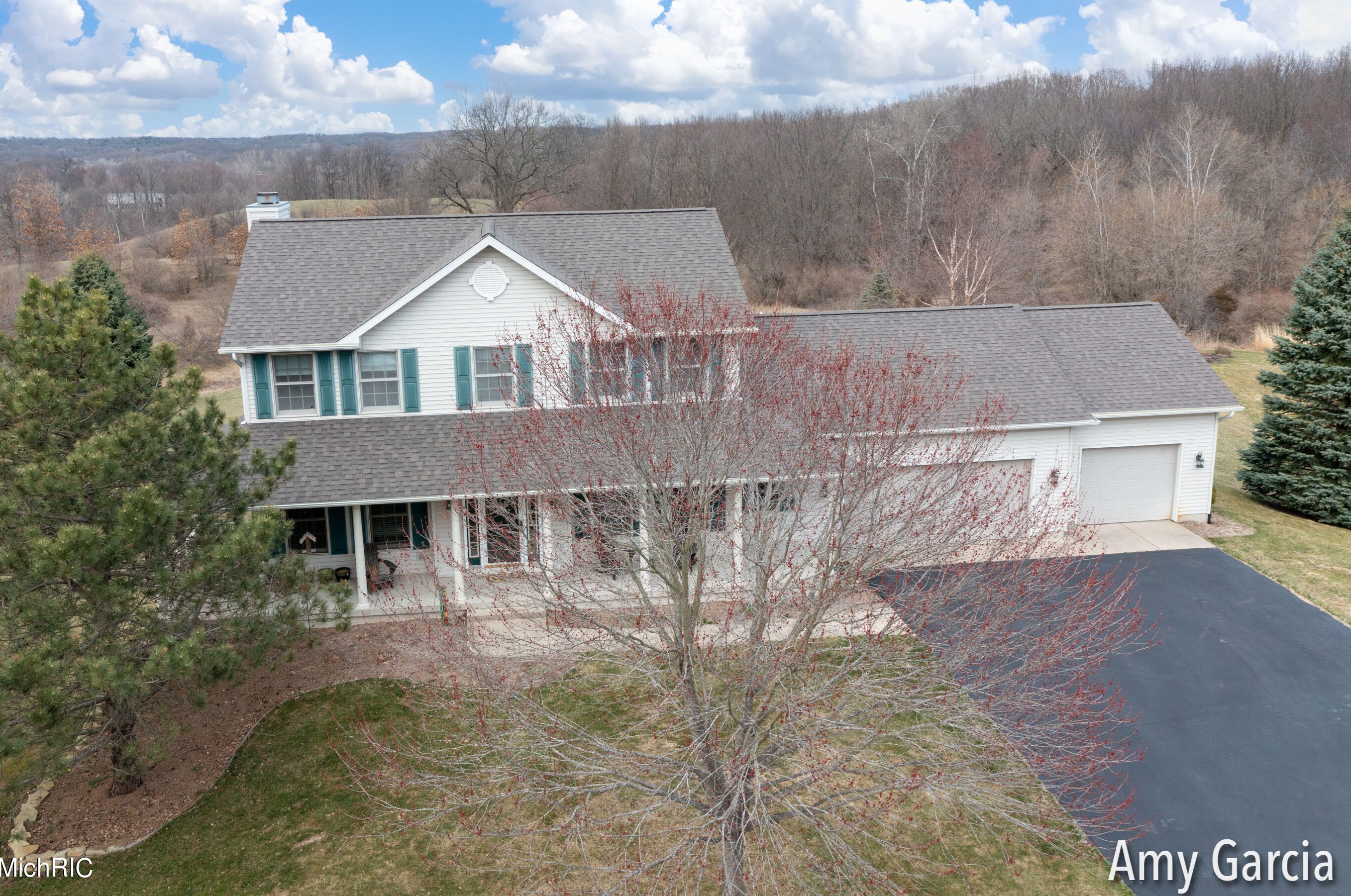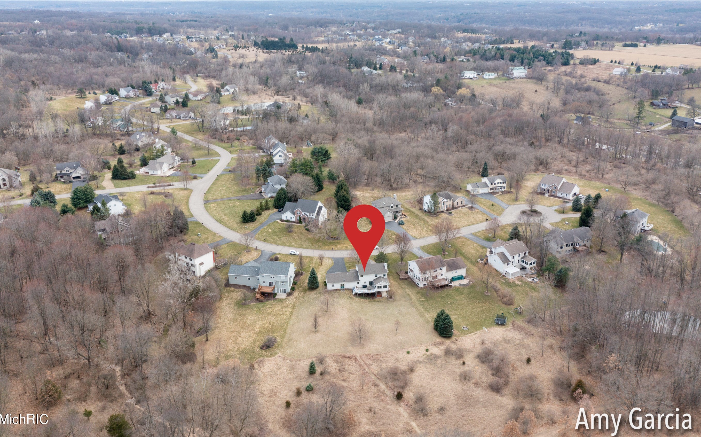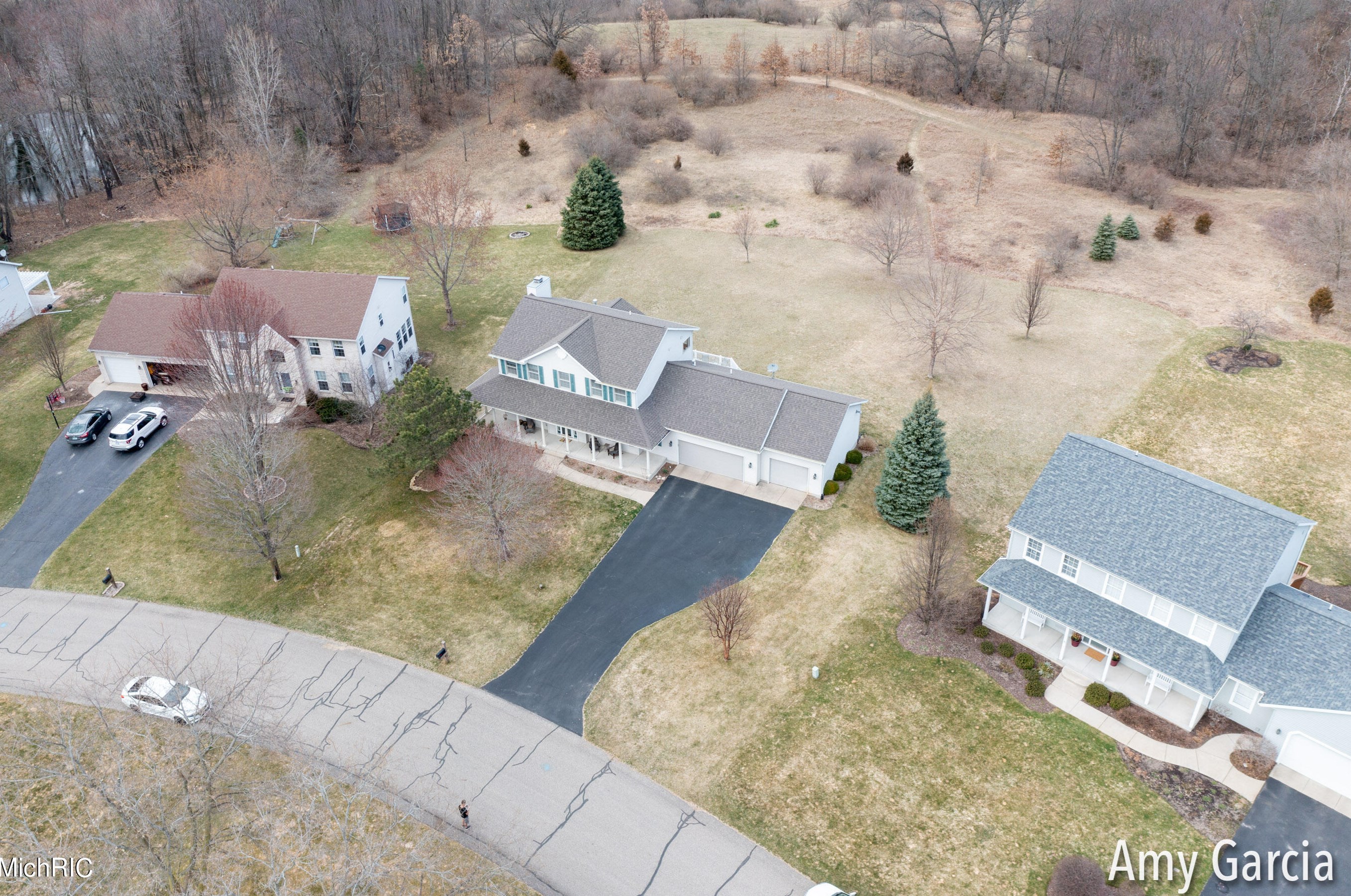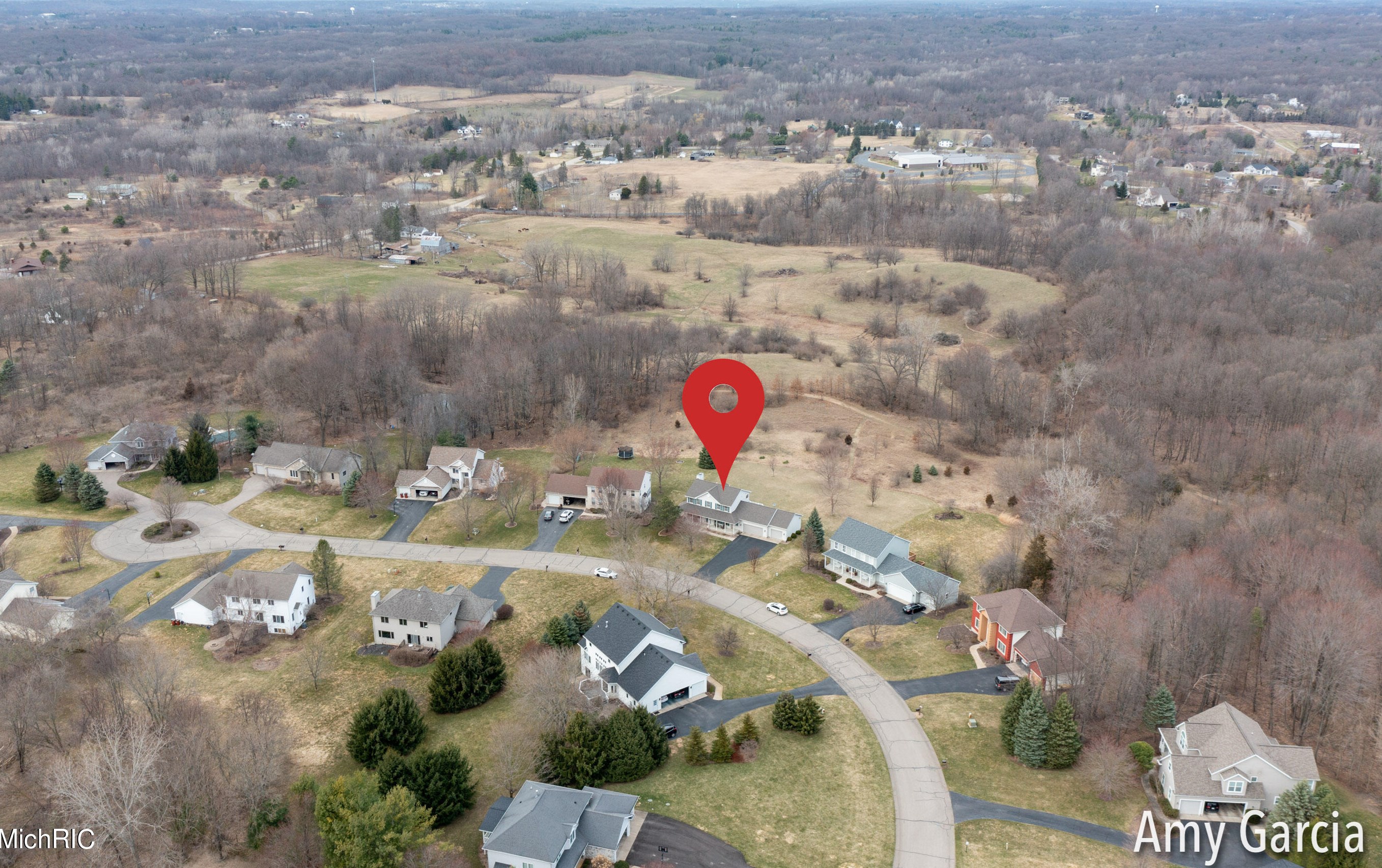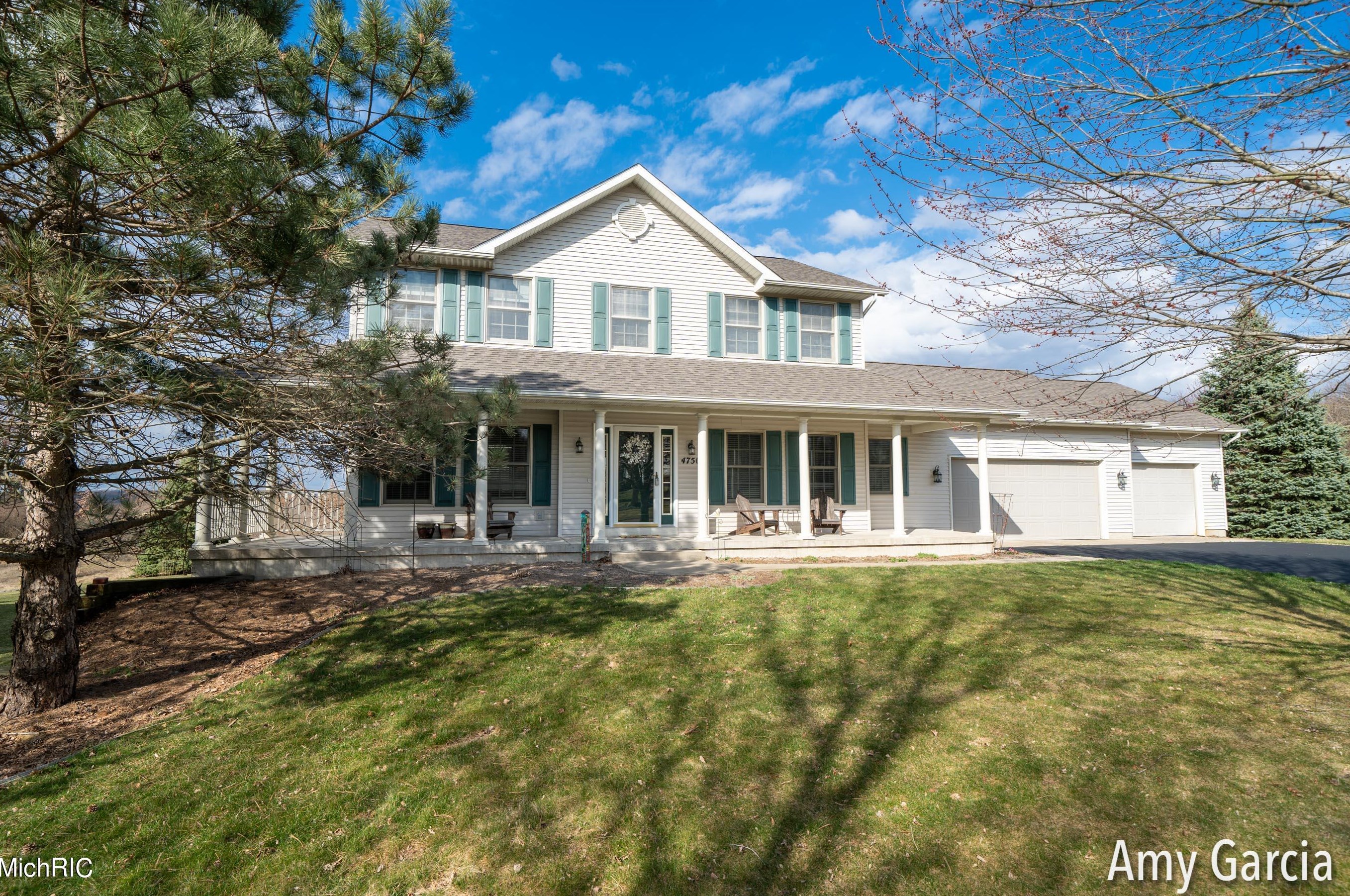 The single-family home stands at the end of the street at 4750 Sunflower Ridge Dr, Ada, MI.