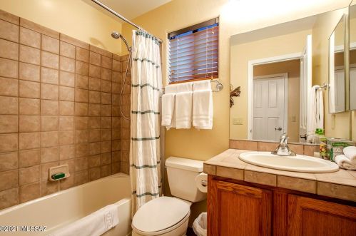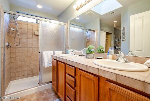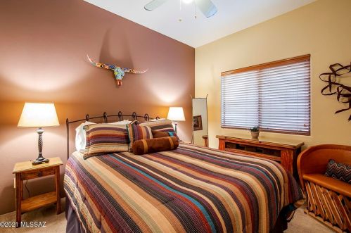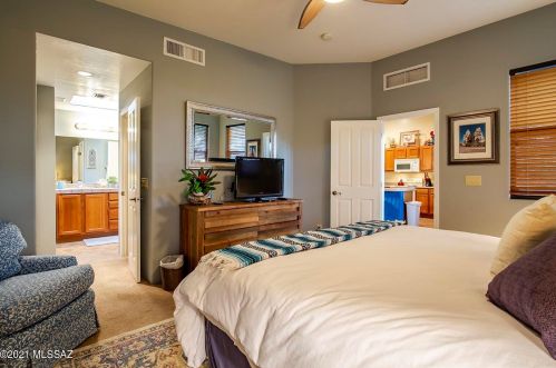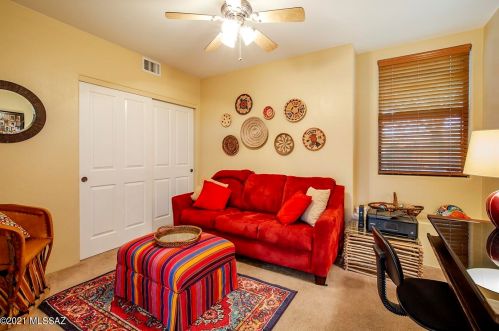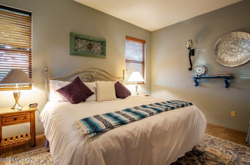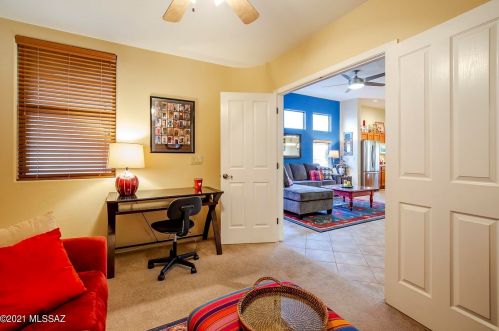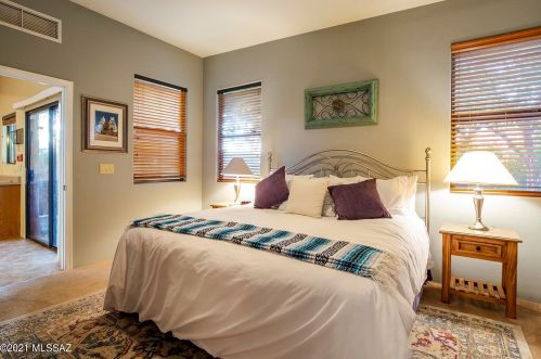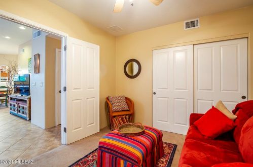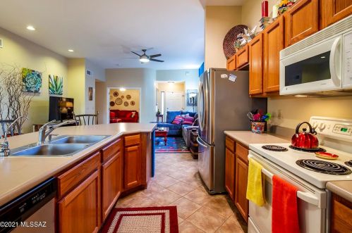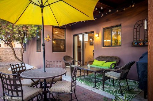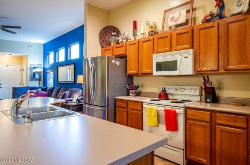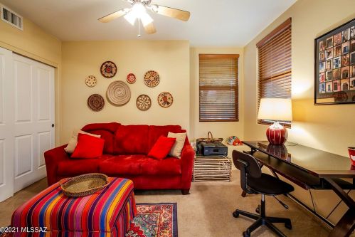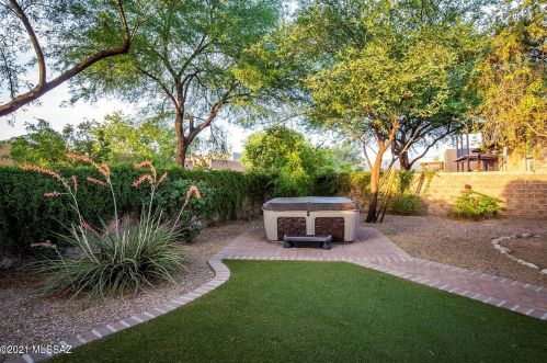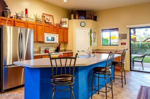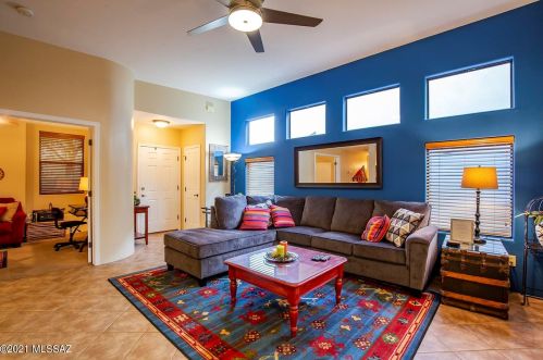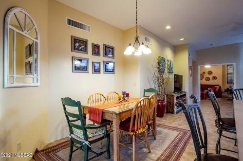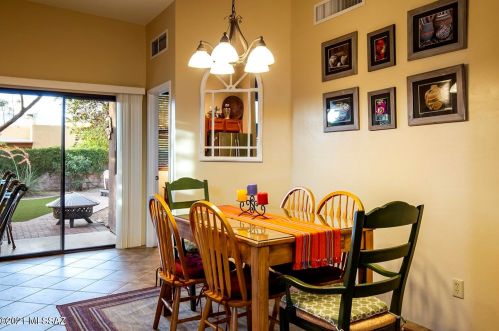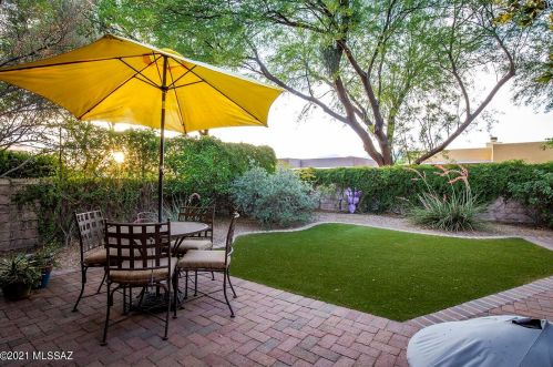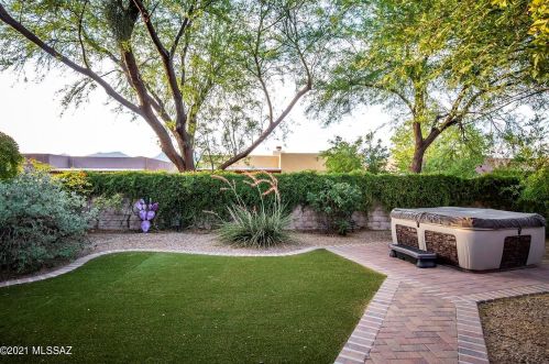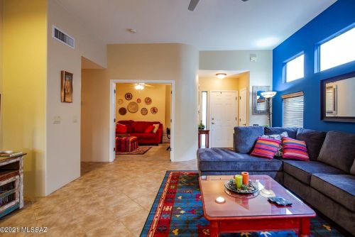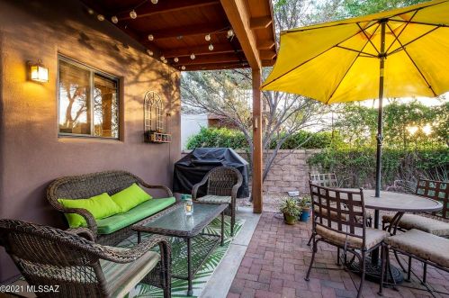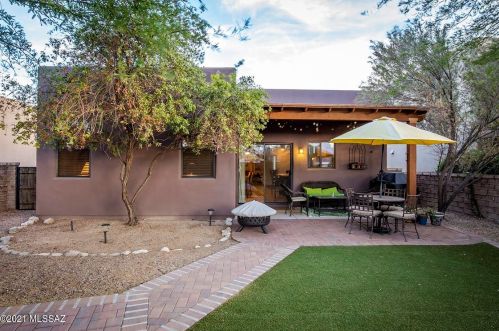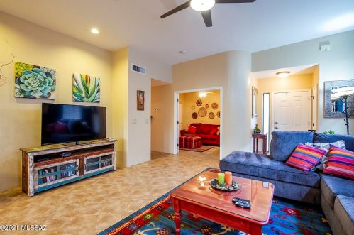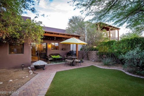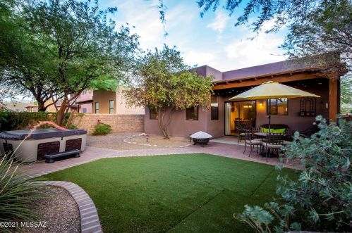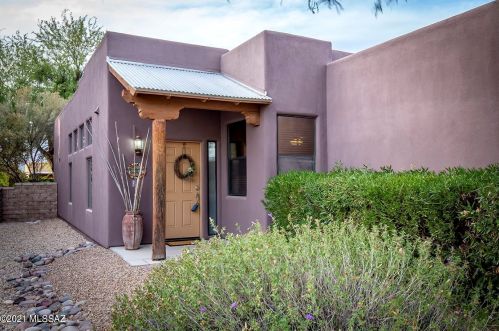 This is a single-family Pueblo style residence, which is situated at 8763 Corte Del Sol Bonito, Tucson, AZ.